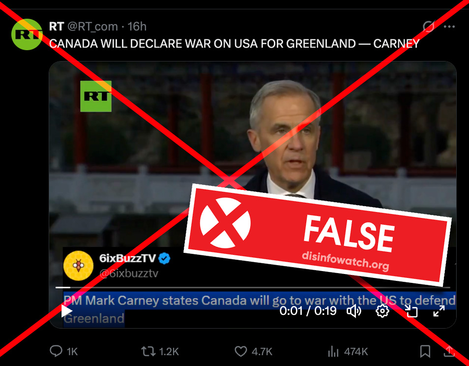 World News@lemmy.world•Russian propaganda outlet RT falsely claims “Canada will declare war on USA for Greenland — Carney”English